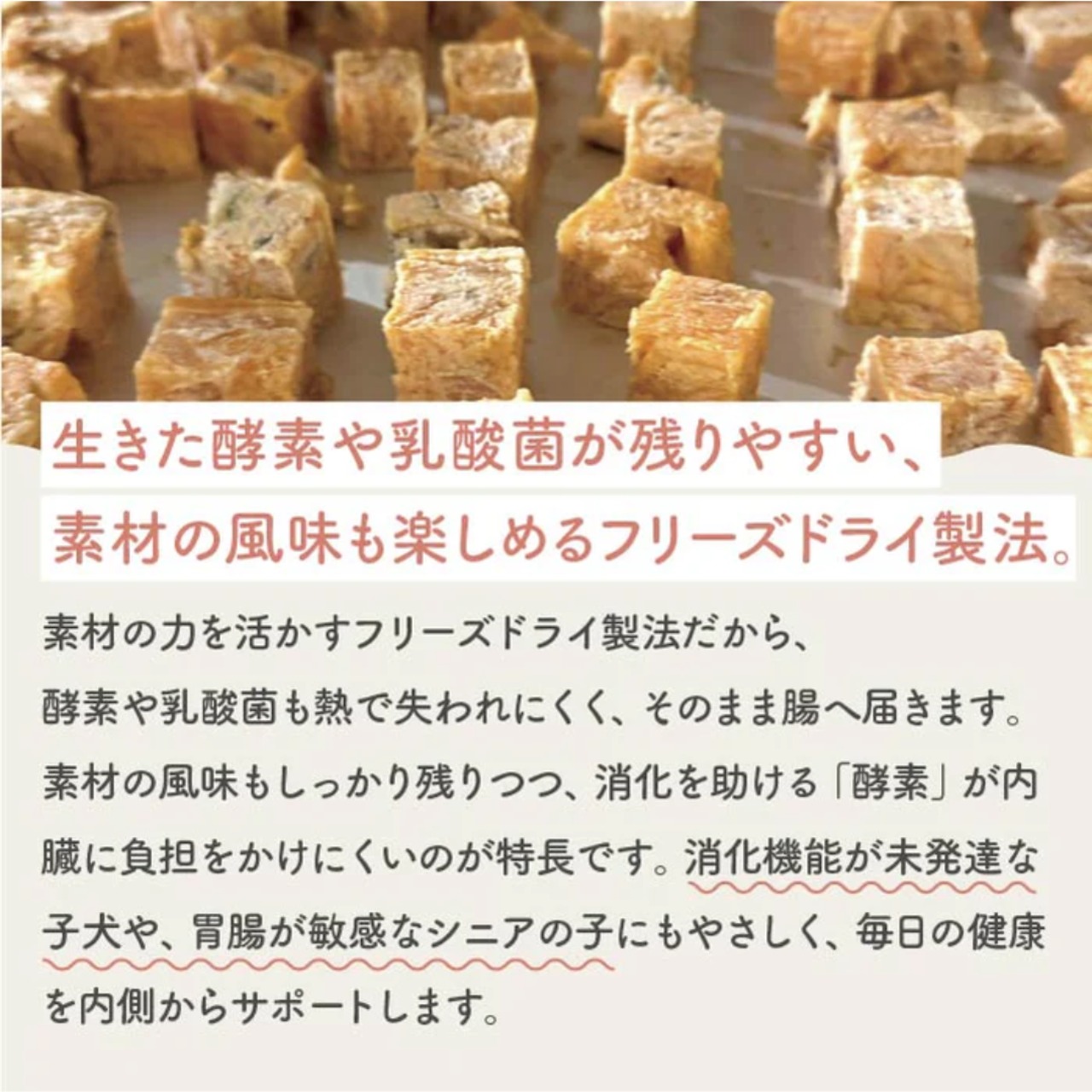 素材の力を活かすフリーズドライ製法だから、酵素や乳酸菌も熱で失われにくく、 そのまま腸へ届きます。肉本来の香りも際立ち、嗜好性を刺激する無添加のご馳走です。消化を助ける「酵素」が内臓に負担をかけにくいのが特長です。消化機能が未発達な子犬や、胃腸が敏感なシニアの子にもやさしく、毎日の健康を内側からサポートします。