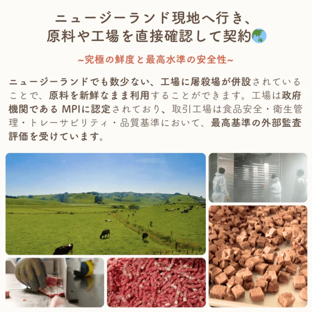 ■原材料:鶏むね肉(皮なし)、ホキ(白身魚)、鶏レバー、鶏ハツ、緑イ貝、アルファルファ濃縮プロテイン、かぼちゃ、ブロッコリー、チコリルート、人参、ホキオイル、乾燥ケルプ、マヌカハニー、ブルーベリー、クランベリー、コンドロイチン、グルコサミン、ターメリック、ジンジャー、炭酸カルシウム、リン酸二カルシウム、ミネラル類(塩化カリウム、塩化ナトリウム、硫酸マグネシウム、硫酸第一鉄、硫酸亜鉛、硫酸銅、硫酸マンガン、セレン酵母、ヨウ素酸カリウム)、塩化コリン、ビタミン類(ビタミンE、ナイアシン、ビタミンA、ビタミンB5、ビタミンB2、ビタミンB1、ビタミンB6、ビタミンB12、ビタミンK、ビオチン、ビタミンD3、葉酸)、酸化防止剤(天然由来:ミックストコフェロール、ローズマリー抽出物)
