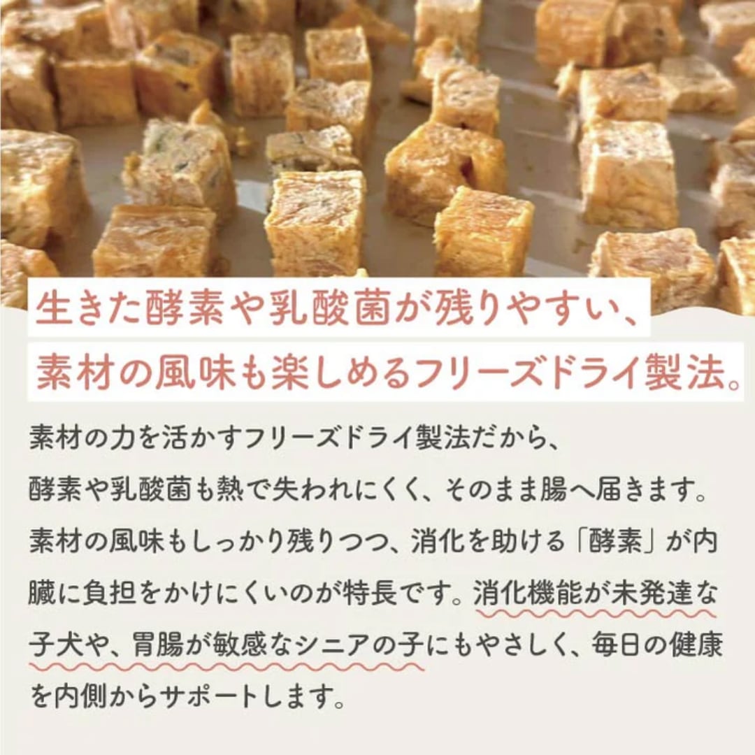 お腹にやさしい消化設計:筋繊維が細く消化しやすい鶏むね肉を使用。フリーズドライ製法で素材の酵素も残りやすい、胃腸がデリケートな子にも安心です。