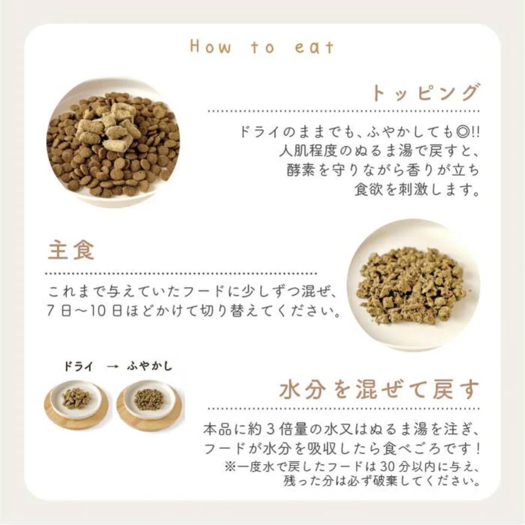 常温保存できることはフリーズドライフードのメリットの1つ。保管場所でもスペースをあまり取らずに済み、お水又はぬるま湯(37℃以下)を加えると元の状態に戻すことができます。必要な量だけ旅行先などにも持って行くことも出来る、とても便利なフードです。