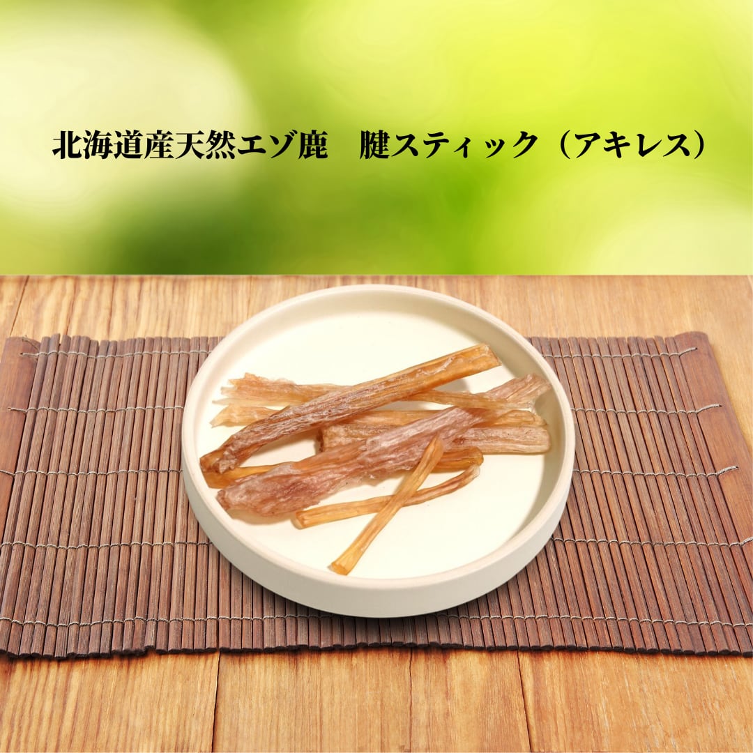 天然のエゾシカのアキレス腱や腱を無添加、無着色で製造したハードタイプの間食おやつです。