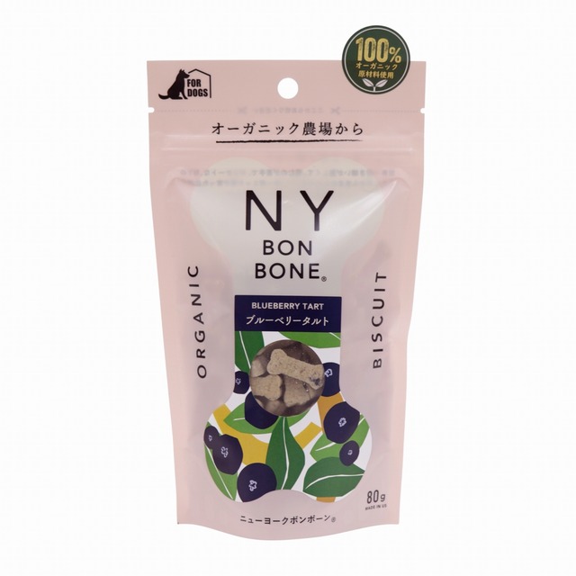 100%オーガニック原料使用。2.4cmの骨型ビスケット 甘酸っぱいブルーベリーが詰まった、いつでも一番人気のブルーベリータルト アントシアニンがワンちゃんの目の健康を維持します ■NY BON BONEとは? 世界一好き嫌いが激しくて、噛むのが苦手で、デリケートな、NYの小さな犬から生まれたビスケット。 オーガニック畑で育った自然の恵みをひとつひとつ混ぜてみたら…オーブンからおいしい香りが。 NY発、小さなからだのことを考えた2.4cmの骨型ビスケット。 《素材》 オーガニックオーツ麦粉、オーガニックオーツ麦、オーガニックチェダーチーズ、オーガニックブルーベリー、オーガニックキャノーラ油、オーガニックブルーベリーフレーバー 【保証成分値】 たんぱく質/12.5%以上 脂質/8.5%以上 粗繊維/2.5%以下 灰分/3.5%以下 水分/8.0%以下 代謝エネルギー/349kcal/100g ■アメリカの認証機関でオーガニック認定を受けた原材料を贅沢に使用! 犬の食物アレルギーに配慮し、小麦、とうもろこし、大豆は使用していません。 また、保存料、着色料、砂糖、塩といった添加物も使用していない、健康を第一に考えたおやつです。 ■オーガニックとは オーガニックとは有機栽培の意味で、化学合成農薬や化学肥料に頼らず、有機肥料などにより土壌の持つ力を活かして栽培する農法のことを指します。 オーガニック農法では、「3年間農薬や化学肥料を使用しない土地で栽培」「化学合成農薬、化学肥料、遺伝子組み換え原材料は使用しない」「合成添加物の使用制限」などが定義づけられています。